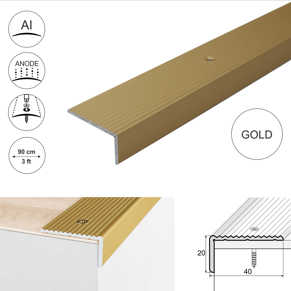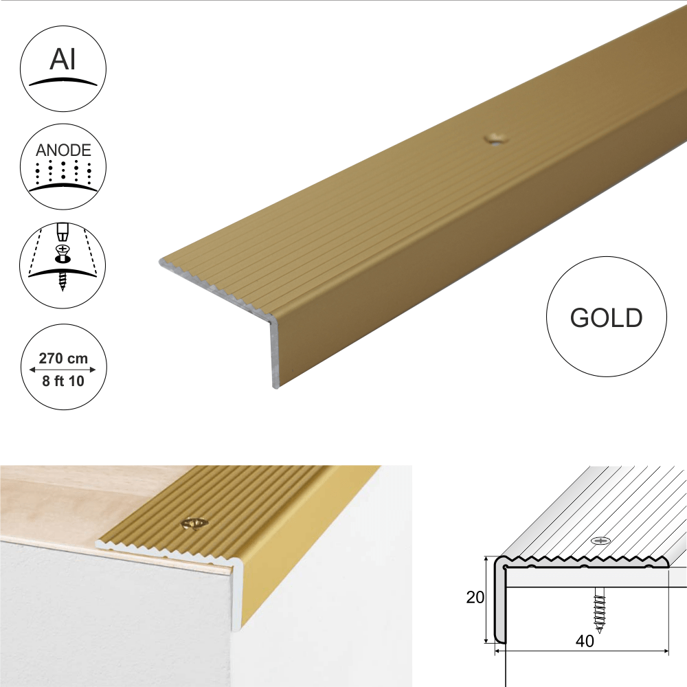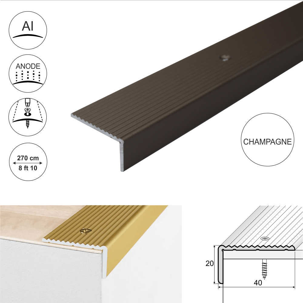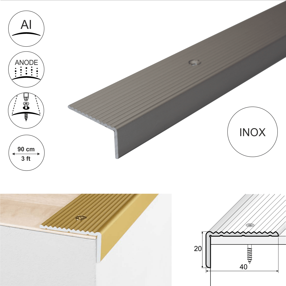 Excellent quality Anodised Aluminium stair nosing, providing you with a perfect finish, as well as preventing any damage to your stairs and disguising any imperfections that aren’t so easy on the eye. Stair nosings are an outstanding way of finishing the edge of your stairs. They come in very attractive colours, This product comes with a single assembly system, consisting of four screws. Simply drill holes, screw the screws into the stair, through the holes already present on your stair nosing